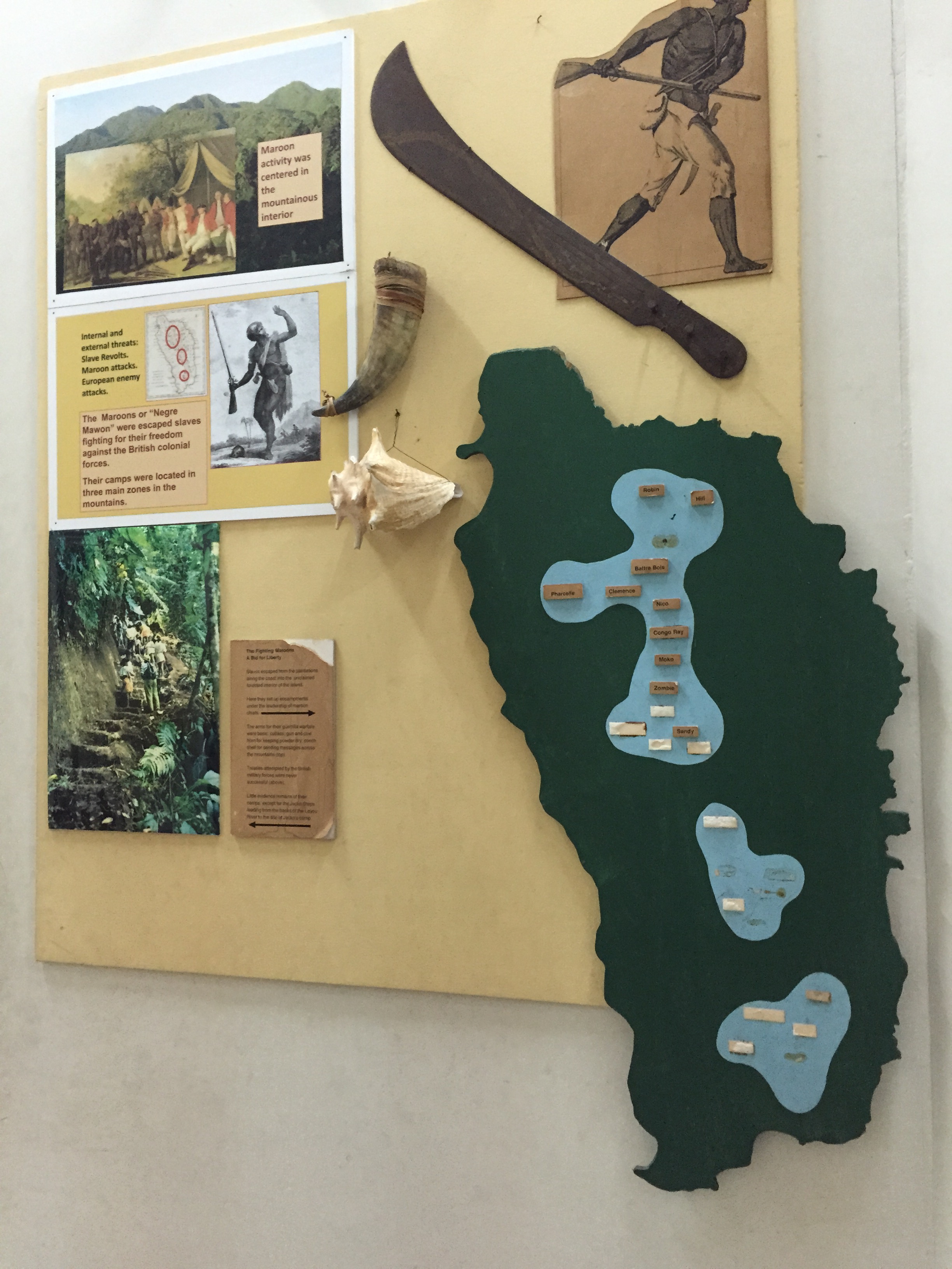 Because of its mountainous, difficult terrain,* Dominica became a Maroon stronghold. By 1785, there were 13 major Maroon camps spread out over the interior of the island, populated by men, women and children. These communities cultivated crops, erected buildings and carried on their own organized societies. They also developed defenses and waged guerrilla warfare on the plantations, oftentimes with stunning success.