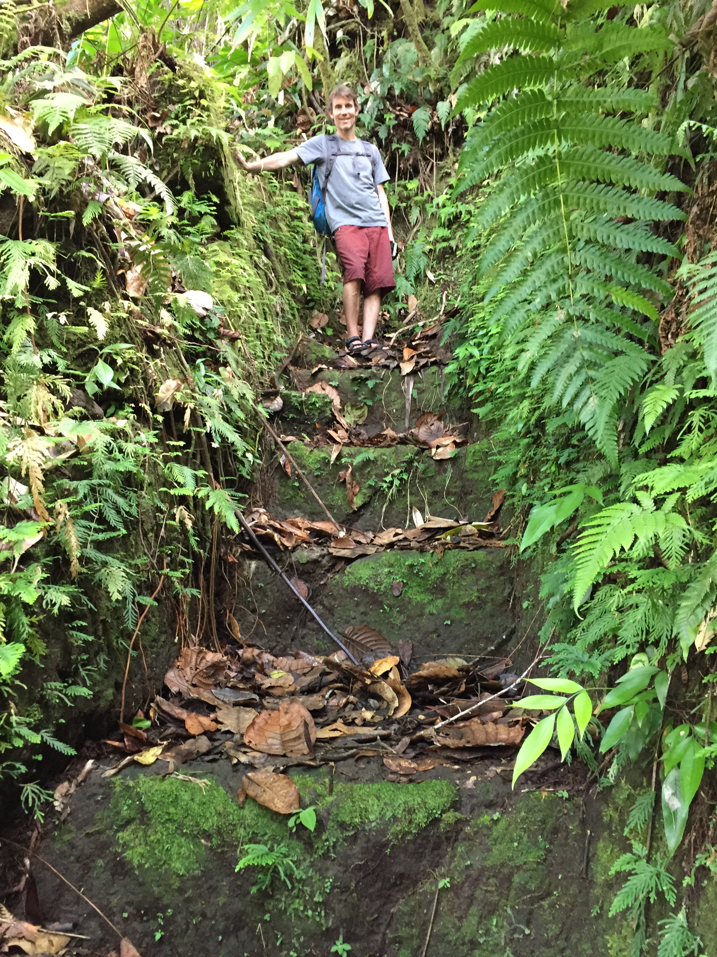 Roberta was quiet (perhaps because we had the competition along?), but we were glad to have her help. She led us up the steep hillside and onto the flats, which we crossed to the edge of two cliffs. And there, cut into the hillside we saw the main attraction of this hike–The Jacko Steps. Descending down the sheer cliff side were a long series of 100’s of steps, each about 3.5ft in height. Jacko’s front entryway.