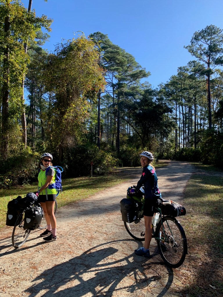 The morning’s ride is on rural roads through small towns and pine plantations.  We even find Sarah’s favorite roadside attraction, Donkeys. The miles tick off easily and we join the busy four lane Highway 24 along the coast, stopping for lunch at a roadside veggie and fruit stand.  The two ladies behind the counter see our loaded bikes and listen to our story.  One of the ladies leans over and loudly whispers, “just go rent a car, and don’t tell anyone you drove to Florida.”  I like her.  And apparently, she likes us too, because as we leave to eat lunch in the yard behind the stand, she tells us that we can use the porta-potty out back.  “We usually don’t let customers use it, but you can.  Just don’t poop in there!” she exclaims.  “If you need to poop, go to the convenience store next door.  It has good food.  They have a grill.”  This is not a conversation I’m used to having in Minneapolis.