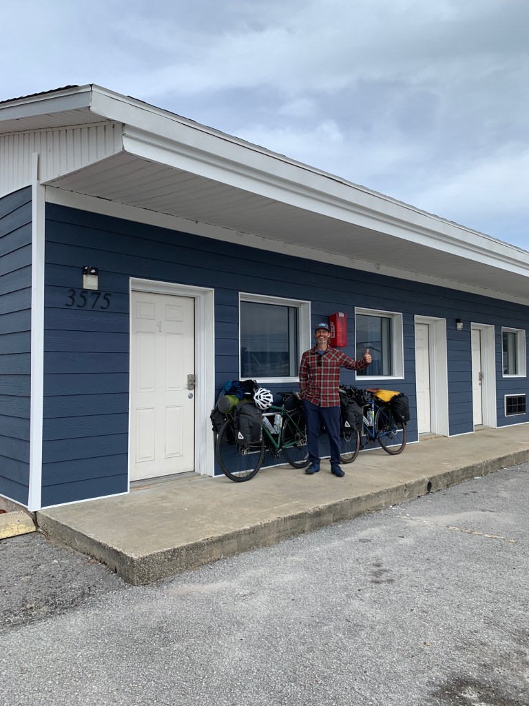 “Holy crap is that it?” Sarah says as we ride beyond the ferry entrance and a dilapidated motel comes into view.  The motel is falling down.  Many rooms don’t have doors.  Adela can’t help but laugh out loud.  The roof is caving in and torn off in several places.  We peek in one open door and see a mattress covered in mold.  Oh boy.  Thankfully, as we ride a bit further, we notice that what appears to be a new motel has been built directly behind this monstrosity.  There is no signage.  Is that the resort?  Sarah masks up, goes into the Bay Breeze Bar, and comes out with the answer.  Yes, that’s the new motel that was built after Hurricane Dorian destroyed the old one.  $78 for the night.  “Sold!” I say.