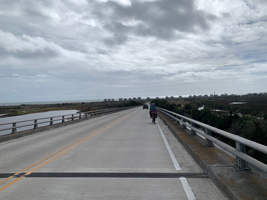 Just before hitting the coast, we turn off of a busy Highway and onto quiet Highway 210, which leads us over the Intracoastal Waterway on a huge bridge to Topsail Island. The view atop the bridge is spectacular—the only hills on this entire trip are the bridges—and I stop for a second to take in the expansive ocean view.  The coastline stretches as far as I can see in either direction, and the narrow spit of land we are about to ride is visible to the south, condo’s sprouting up like lego blocks along the roadway.  “Sweet!” I yell, but Adela and Sarah are already over the bridge.