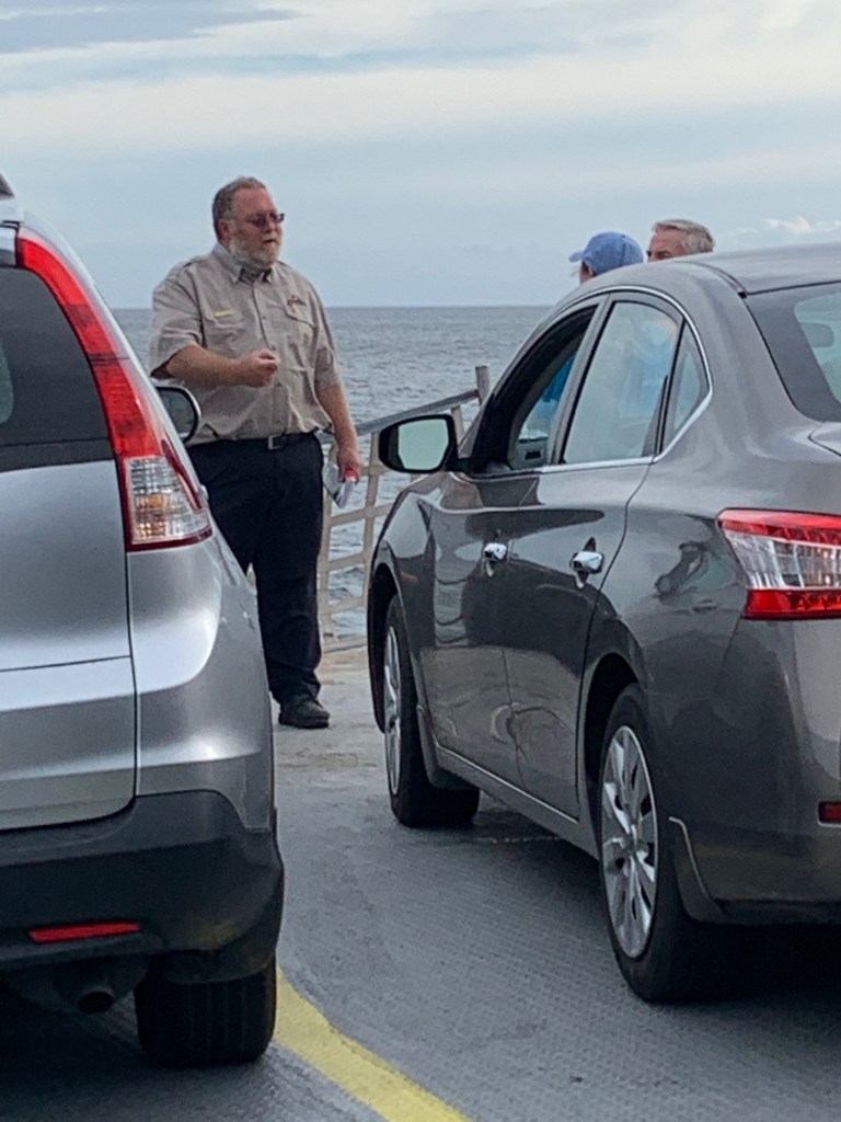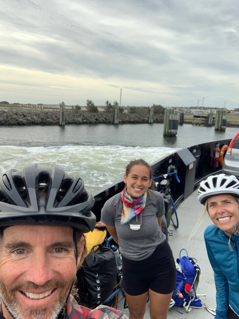 “Why are we always late?” Sarah says as we watch Adela cycle off to the ferry at 6:50am.  We are scrambling as usual, but we make it with some time to spare.  It’s still relatively calm, and I’m excited for the two hour and thirty-minute ferry ride south across the Pamlico Sound to Cedar Island.  We park our bikes next to Adela’s and head to the second-floor deck.  Adela is deftly moving around the ferry, interviewing people for what we learn is a forthcoming art project.