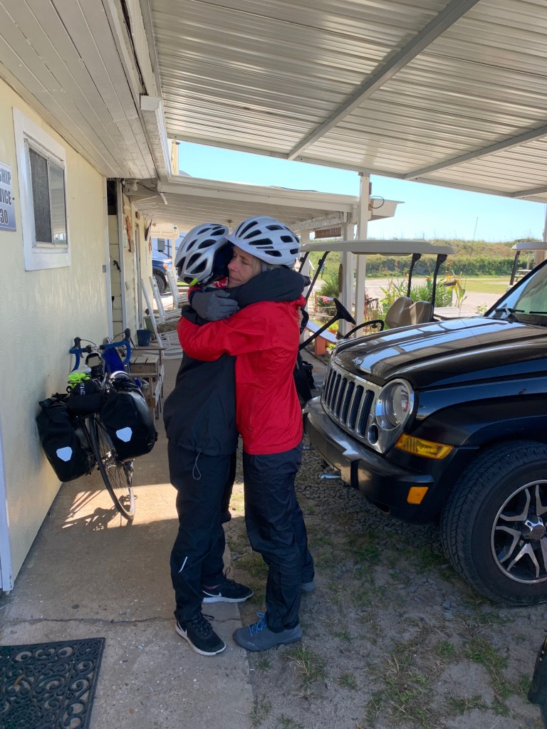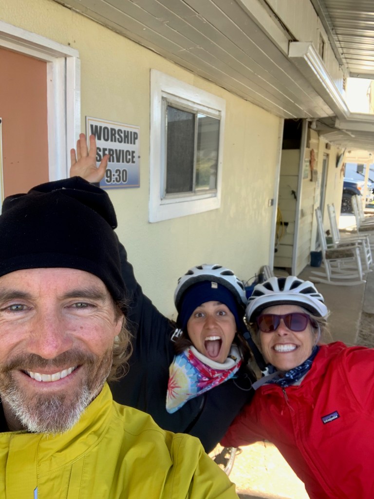 Sarah and I checked into our room and are just returning from a long walk down the remote and wild beach next to the motel when a squad car rolls up next to us, looking for a man that’s been hassling people in the area.  It’s so windy that we have to shield our eyes from blowing sand.  “Do you think Adela’s o.k.?” I say to Sarah as the squad car drives away.  But not to fear, we find Adela checking into a room just down from ours a few minutes later.  The Duke guy was friendly, and not a police fugitive.  She tried to set up her tent with his help, but it was blowing flat in the wind and she was worried it would be ripped to shreds.  We are thankful she will be out of the storm tonight.
