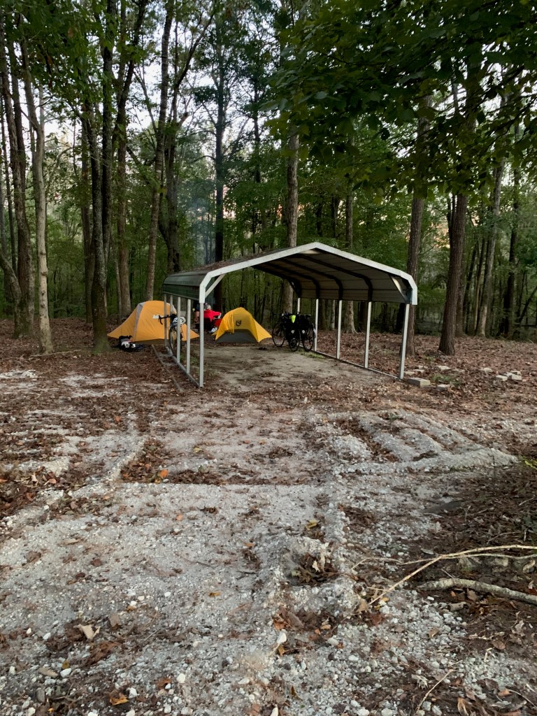 “Happy Halloween!” the two kids at the campsite yell as they run by in the morning.  Oh yes, I forgot it was Halloween.  Our plan for the day is to make it to the Cabin Creek campground just south of Jacksonville, North Carolina.  It’s the only campground listed on our Adventure Cycling maps that is within striking distance, around 60 miles away.  Their website says they offer tent camping, so we should be all set.