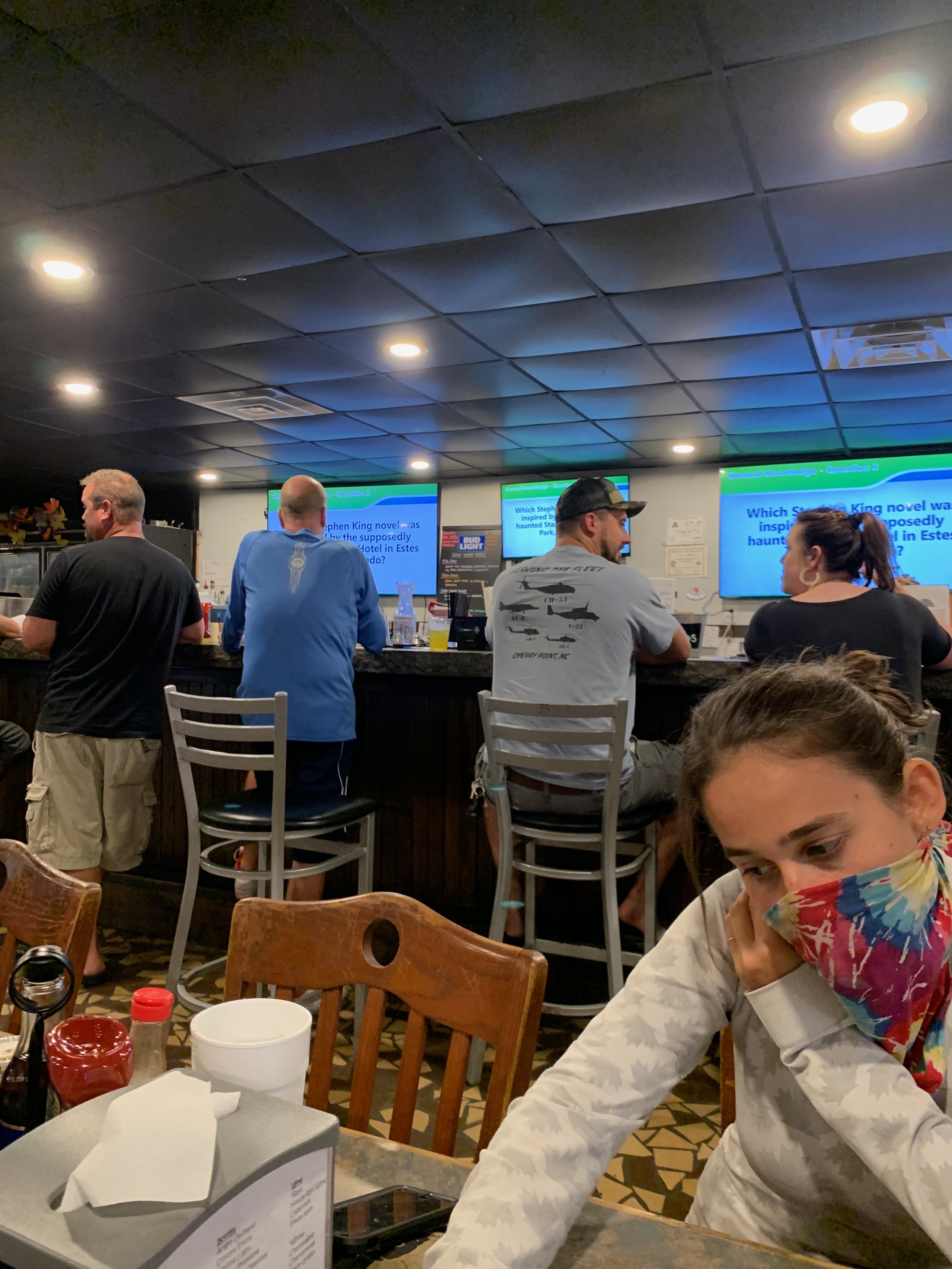 At the risk of incriminating ourselves, the three of us decide to head next door to see if it looks safe to have an early dinner at the Bay Breeze Bar and Restaurant.  The place is empty, except for two guys at the end of the bar, so we sit down and order.  It was a big mistake.  The meal takes forever, a parade of people pack into the place—none of them wearing masks and several without shoes—and we get cajoled into participating in Doug’s Trivia Night, competing against Doug himself, who is unexpectedly home because the high winds shut down the ferry.  Before we leave, a big group of people arrive dressed in elaborate costumes, including Adela’s friend from Duke, who is dressed flamboyantly as the superhero Robin.  As we leave, a group outside the bar tries to get me to eat a dead fish in a bucket.  It was an appropriate end to the evening.