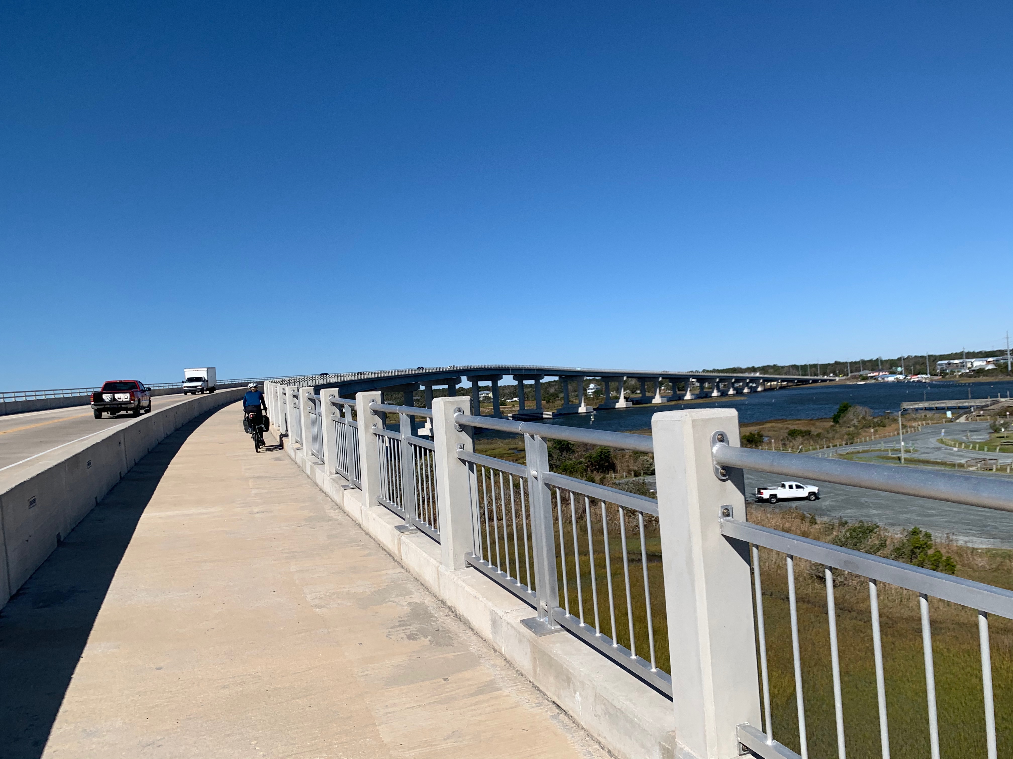 Just before hitting the coast, we turn off of a busy Highway and onto quiet Highway 210, which leads us over the Intracoastal Waterway on a huge bridge to Topsail Island. The view atop the bridge is spectacular—the only hills on this entire trip are the bridges—and I stop for a second to take in the expansive ocean view.  The coastline stretches as far as I can see in either direction, and the narrow spit of land we are about to ride is visible to the south, condo’s sprouting up like lego blocks along the roadway.  “Sweet!” I yell, but Adela and Sarah are already over the bridge.