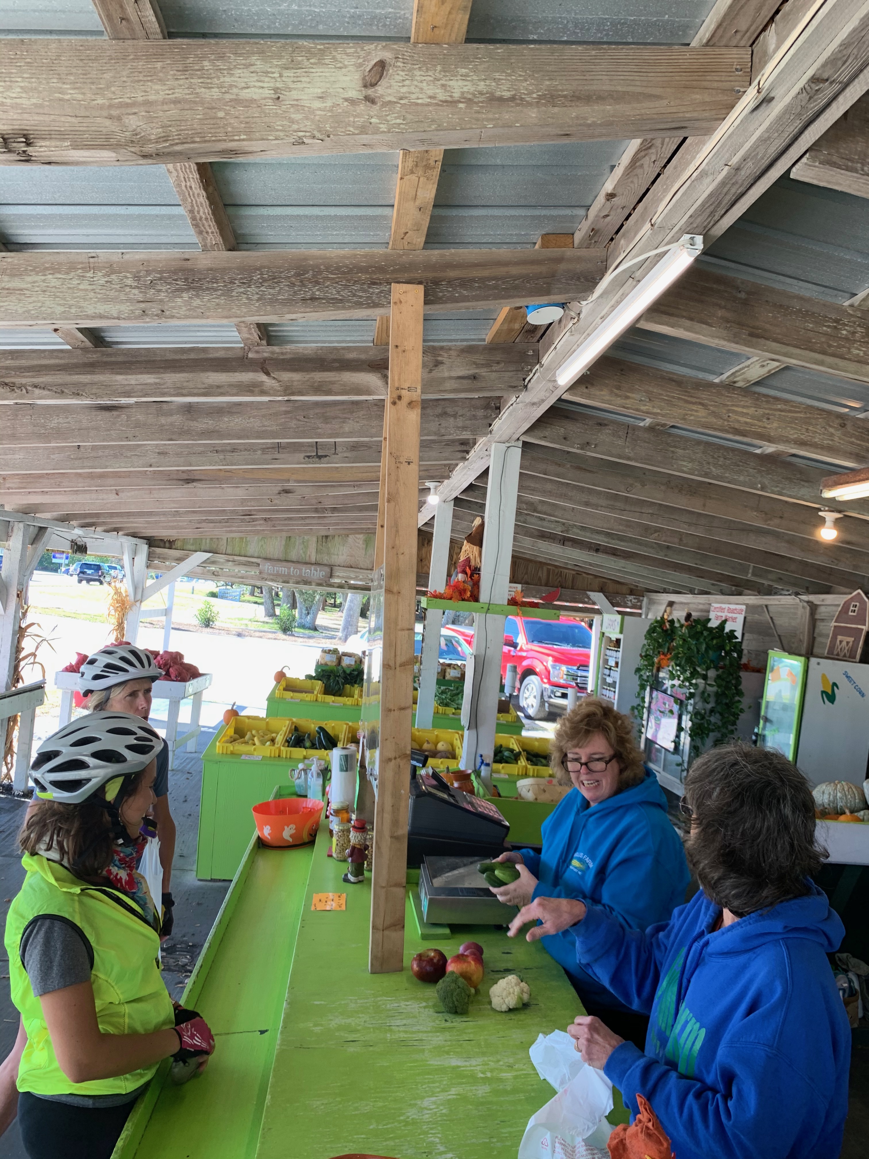 The morning’s ride is on rural roads through small towns and pine plantations.  We even find Sarah’s favorite roadside attraction, Donkeys. The miles tick off easily and we join the busy four lane Highway 24 along the coast, stopping for lunch at a roadside veggie and fruit stand.  The two ladies behind the counter see our loaded bikes and listen to our story.  One of the ladies leans over and loudly whispers, “just go rent a car, and don’t tell anyone you drove to Florida.”  I like her.  And apparently, she likes us too, because as we leave to eat lunch in the yard behind the stand, she tells us that we can use the porta-potty out back.  “We usually don’t let customers use it, but you can.  Just don’t poop in there!” she exclaims.  “If you need to poop, go to the convenience store next door.  It has good food.  They have a grill.”  This is not a conversation I’m used to having in Minneapolis.